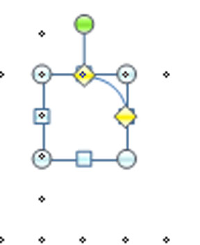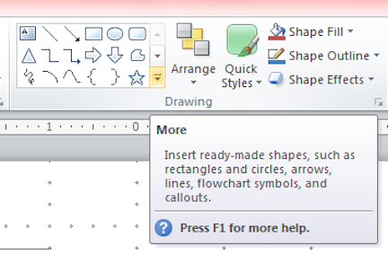 Other useful shapes (like the Arc tool, used for showing which way a door opens) can be accessed also from the Drawing tab. Arcs can be changed by adjusting the yellow diamonds after they are selected. Arcs (and other ready-made shapes) can be accessed by clicking the little downward-pointing More arrow in the side of the box of shapes. This opens a long box of shapes, most of which are not quite right for floor plans.