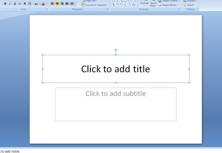 Double click on the border of the text box that reads "Click to add title." When it is selected, use the backspace key on the keyboard to delete it. Do the same with the "Click to add subtitle" text box. |