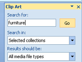 | Use the Shapes and drawing tools to create your own furniture. Make sure your furniture is to scale and is in proportion to your floor plan. Also make sure it is in the "from the ceiling looking down" (that is, floor plan) view. OR To insert clip art of furniture choose Clip Art from the Insert tab. A Search box will appear on the side of the screen. Suggested categories to search for include "furniture" and "office layout."